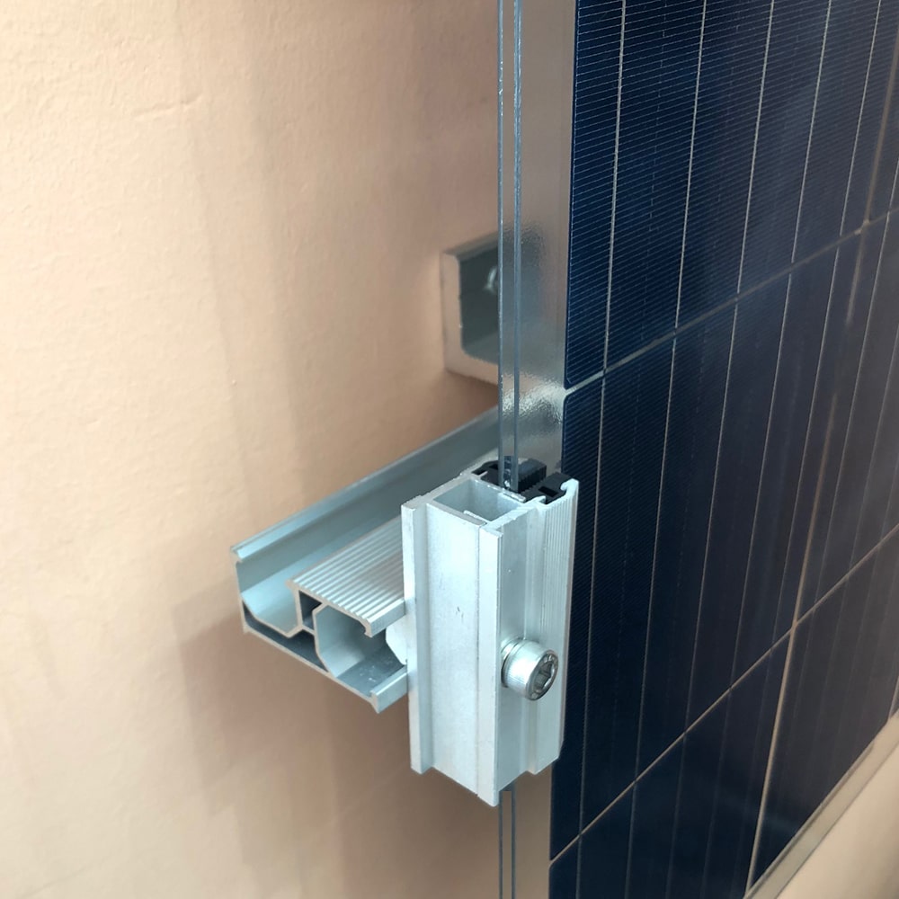 Концевой зажим для крепежа стеклянных солнечных модулей без рамы ( dual glass ) к направляющей рейке.